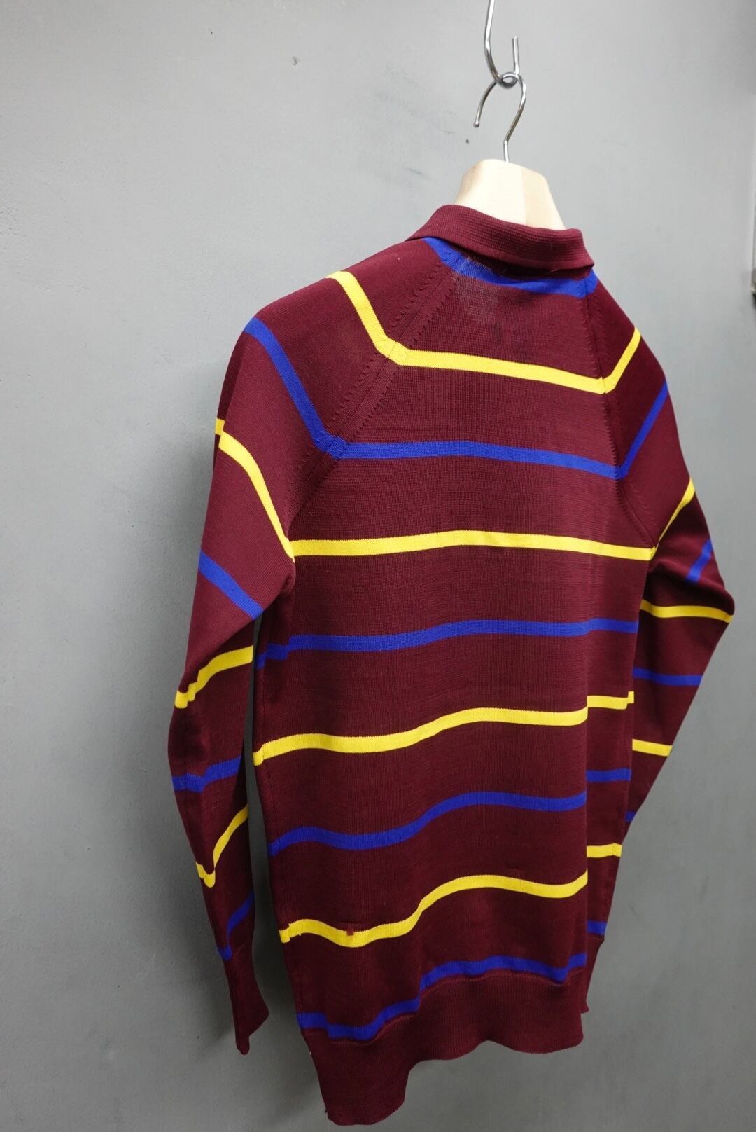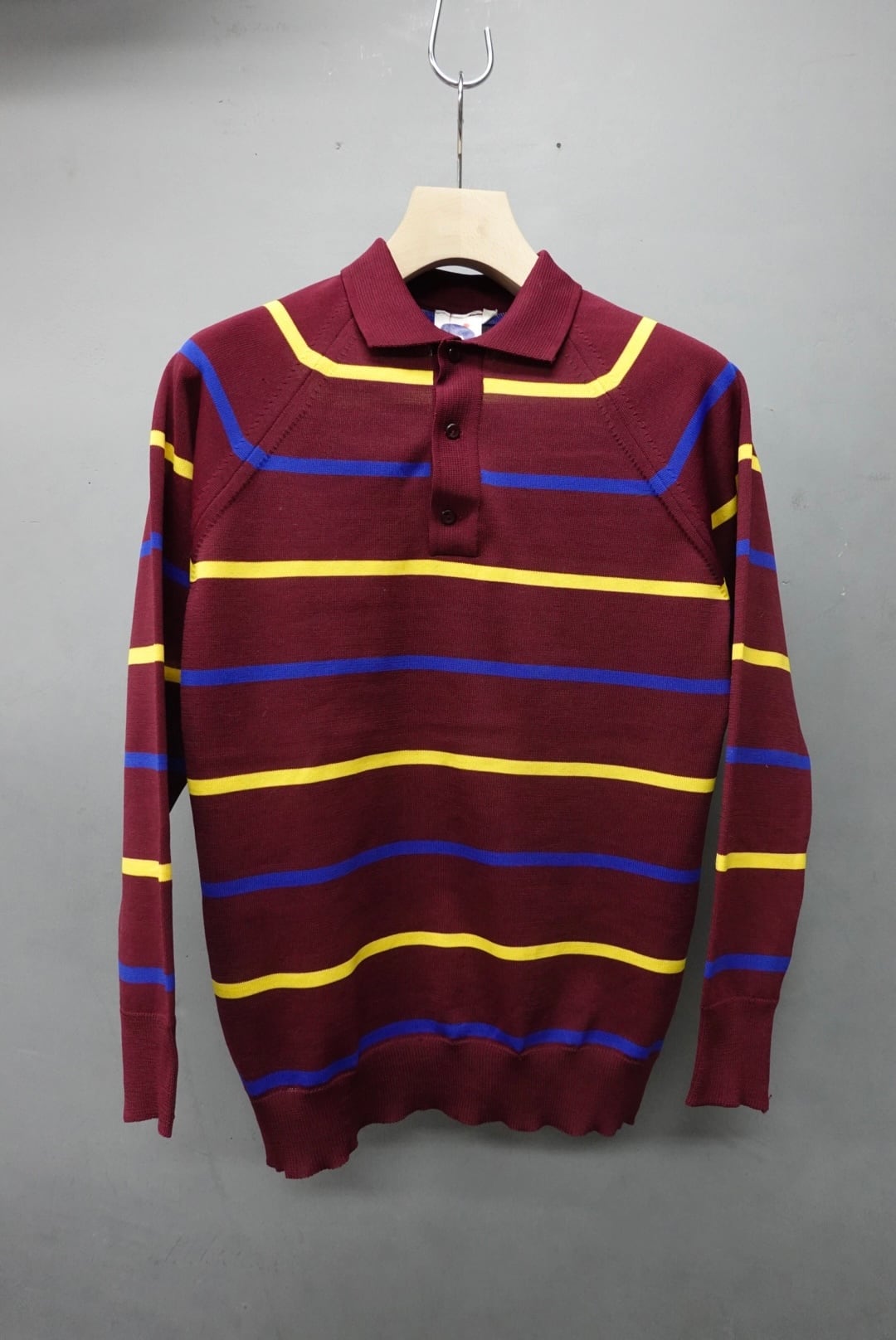 ワインレッドに青と黄色が映えるマルチボーダー。